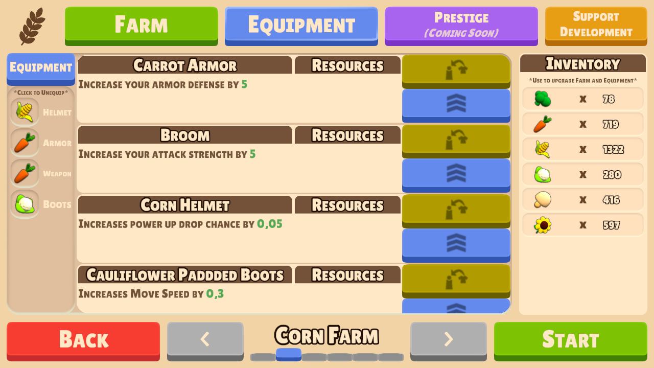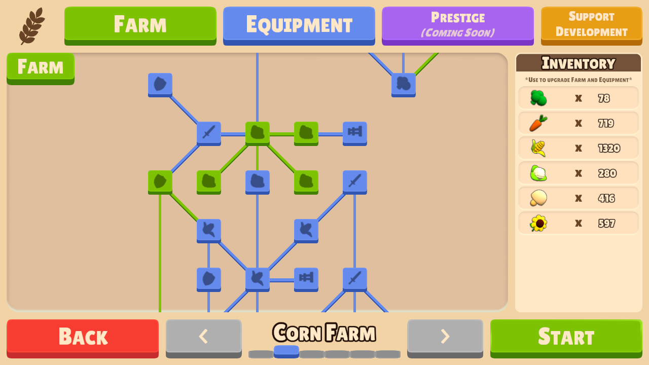 - Prestige to unlock Advanced upgrades for your Farm.